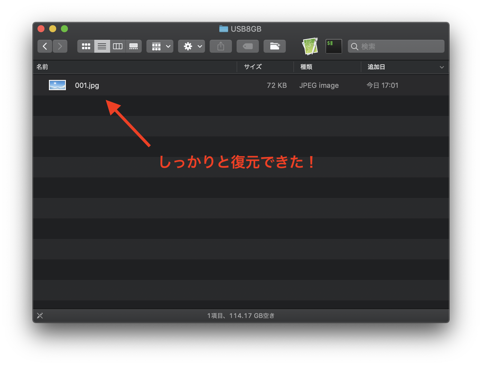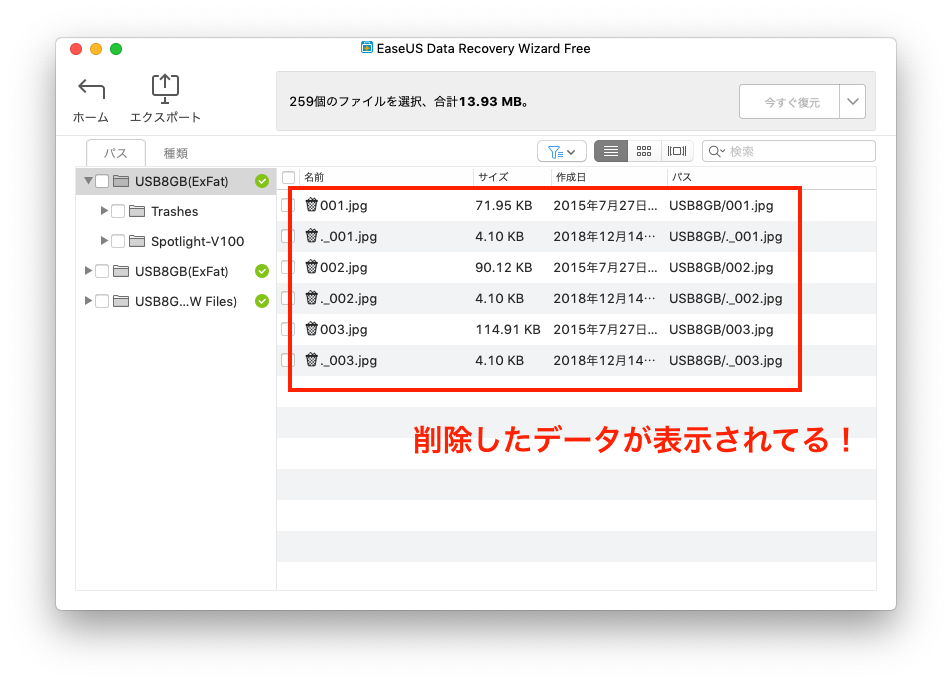 スキャン終了。すると削除したはずのデータがしっかりと表示されています!