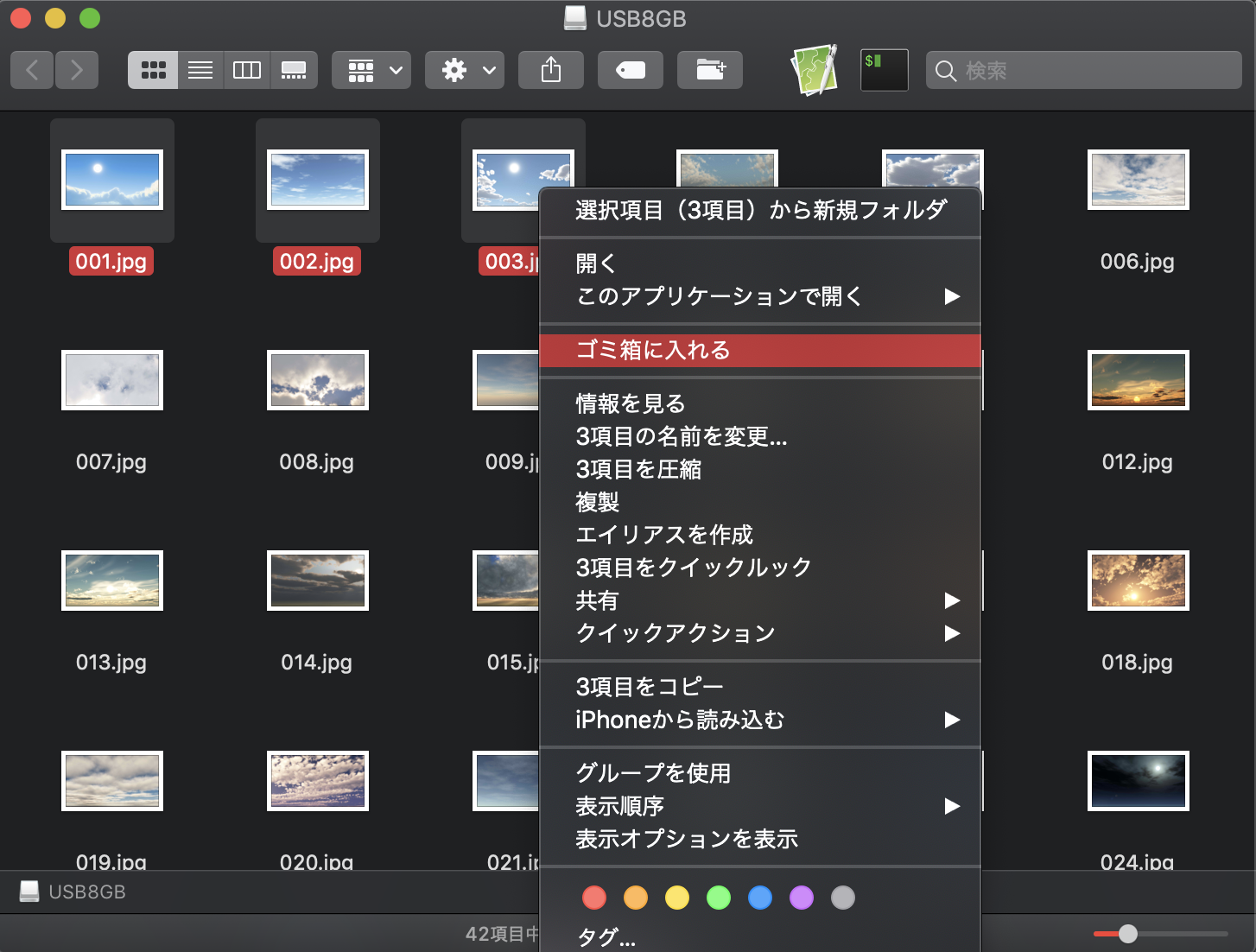 3つ画像ファイルが消えました。もちろん、ゴミ箱からも完全に消去しています。