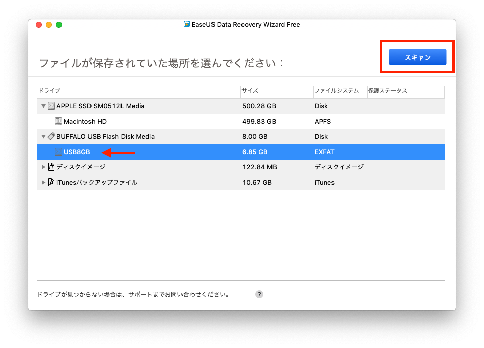 データ復旧するデバイス(今回はUSBメモリ)を選択して「スキャン」をクリックします。
