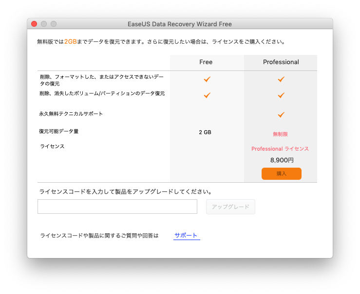 本ソフトは有料版もあります。有料版では復元データ量に制限がなかったり、技術サポートも用意されています。気になる方はご検討してみてください。