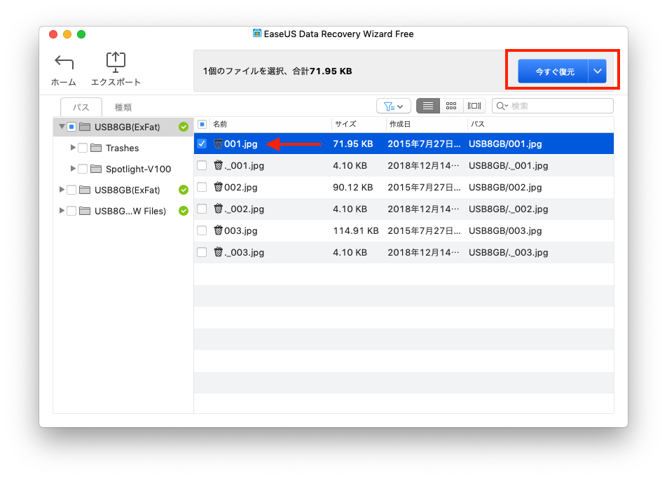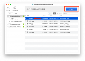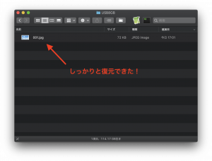 そこで、「1.jpg」というファイルを復元してみることにします。復元方法は復元したいファイルにチェックを入れて「今すぐ復元」を押すだけ。簡単ですね。